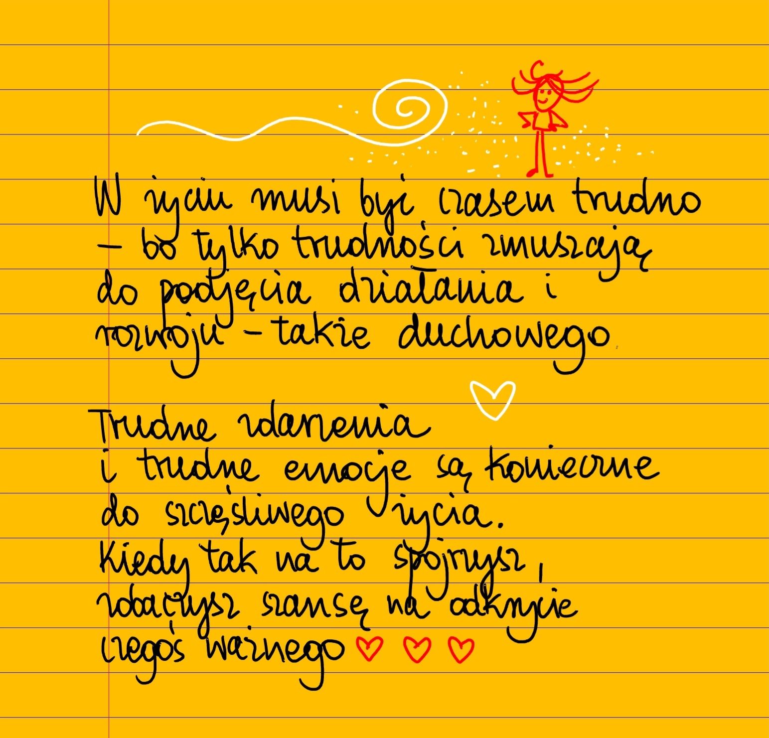W życiu musi być czasem trudno, bo tylko trudności zmuszają do wyjścia ze strefy komfortu, podjęcia działania i rozwoju – zarówno fizycznego, jak i mentalnego oraz duchowego. Trudne zdarzenia i trudne emocje są konieczne do szczęśliwego życia. Kiedy spojrzysz na to z takiej perspektywy, zupełnie inaczej podejdziesz do przeciwności i problemów. Będziesz w nim widział szansę na przyśpieszenie rozwoju, znalezienie czegoś ważnego, osiągnięcie wyższego poziomu. #żóltakartka #beatapawlikowska