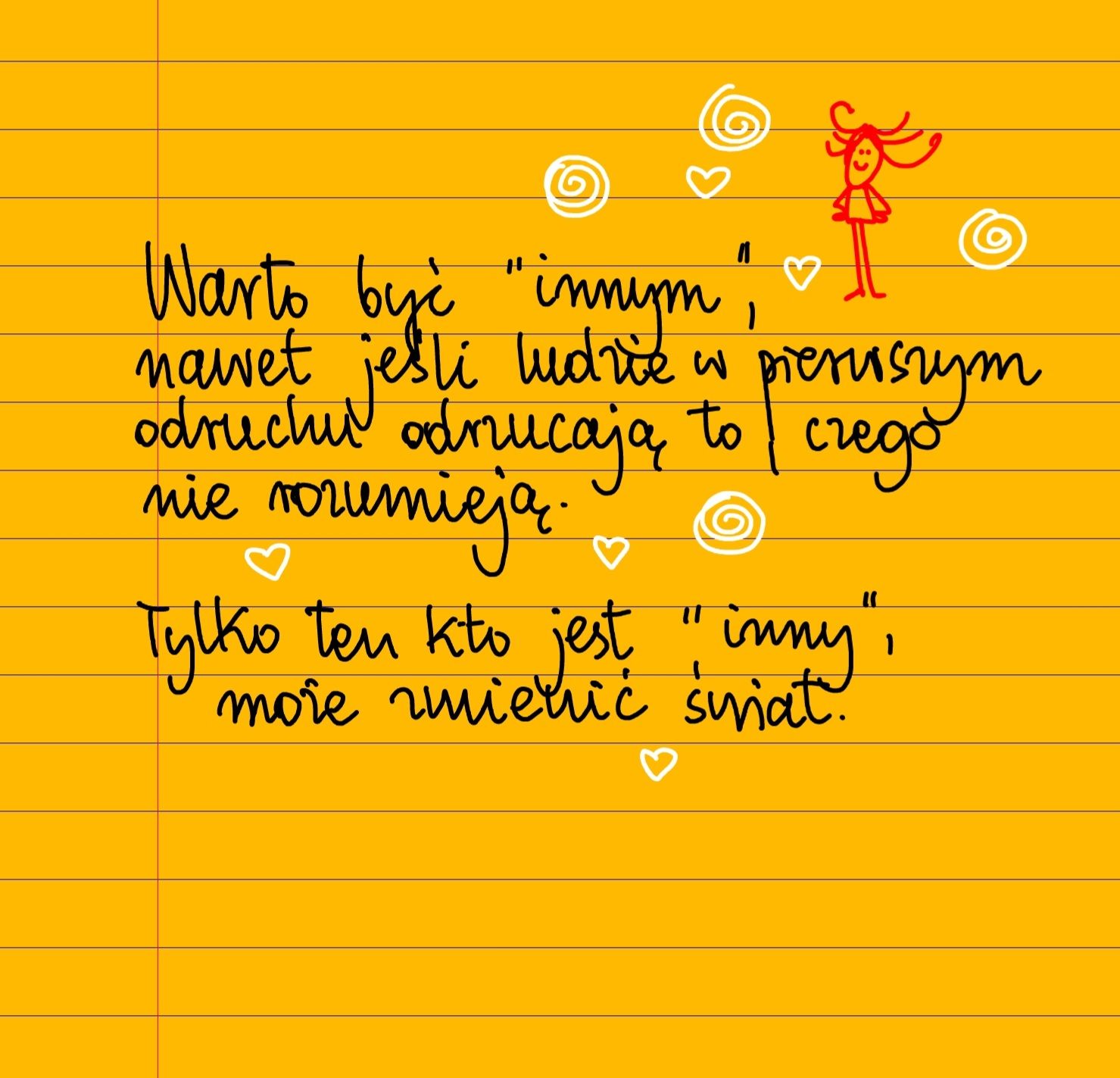 Warto być „innym”, nawet jeśli ludzie w pierwszym odruchu odrzucają to, czego nie znają i nie rozumieją. Tylko ten, kto jest „inny”, może zmienić świat. #żółtakartka #beatapawlikowska