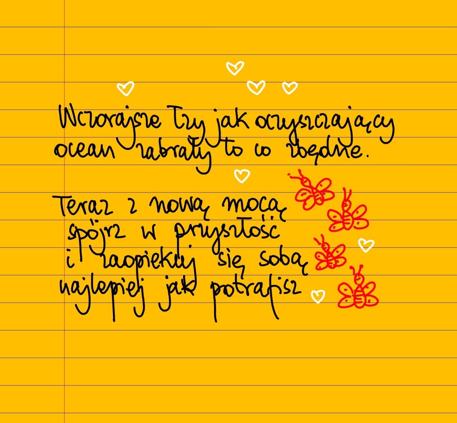 Wczorajsze łzy jak oczyszczający ocean uniosły w dal to, co zbędne. Teraz z nową mocą spójrz w przyszłość i zaopiekuj się sobą najlepiej jak potrafisz. #żółtakartka