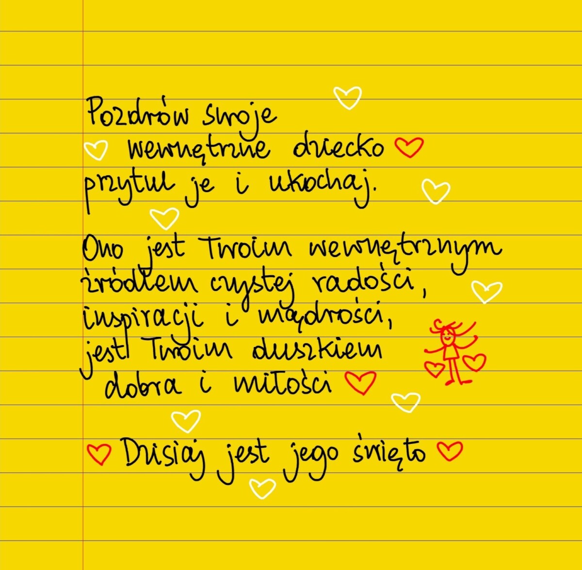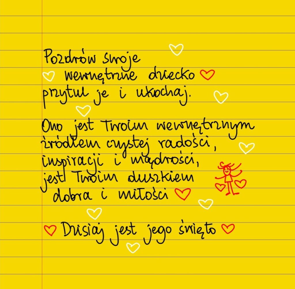 Pozdrów swoje wewnętrzne dziecko, przytul je i ukochaj. Ono jest twoim wewnętrznym źródłem czystej radości, inspiracji i mądrości, jest Twoim duszkiem dobra i miłości. Dzisiaj jest jego święto. #żółtakartka