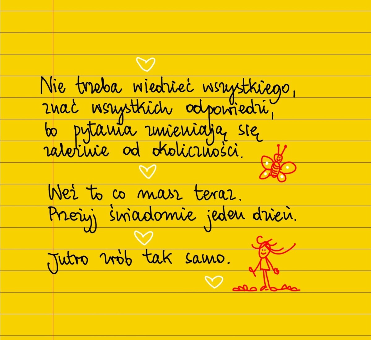 Nie trzeba wiedzieć wszystkiego, znać wszystkich odpowiedzi, bo pytania zmieniają się zależnie od okoliczności. Weź to co masz teraz. Przeżyj świadomie jeden dzień. Jutro zrób tak samo. #żółtakartka