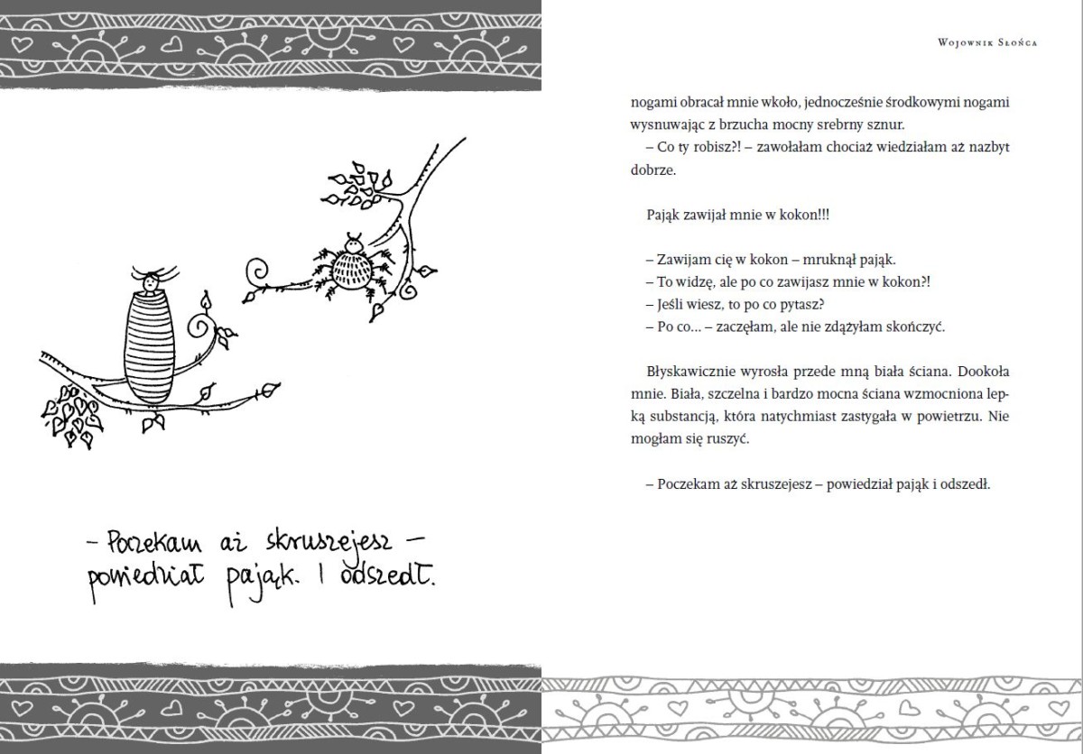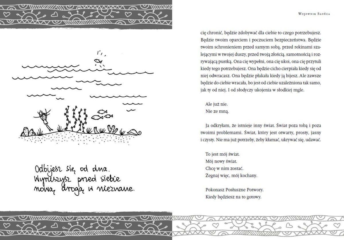 Dopóki nie zostaną nakarmione ludzkimi emocjami zła, nie mają własnych. Kąpią się w rzece, schną w słońcu, lubią młode pędy i zapach bratków. Czasem wędrują, czasem śpią, czasem zatrzymują się w jednym miejscu na dłużej. Nie ścigają ludzi. Chyba że ktoś rzuci im wyzwanie, pogwałci ich spokój, sprowokuje do walki. Wtedy byłyby gotowe mnie pożreć i rozszarpać na strzępy. Bo nie mogą znieść mojego strachu, przywiązania do bycia ofiarą, wiecznego cierpienia i nienawiści.
