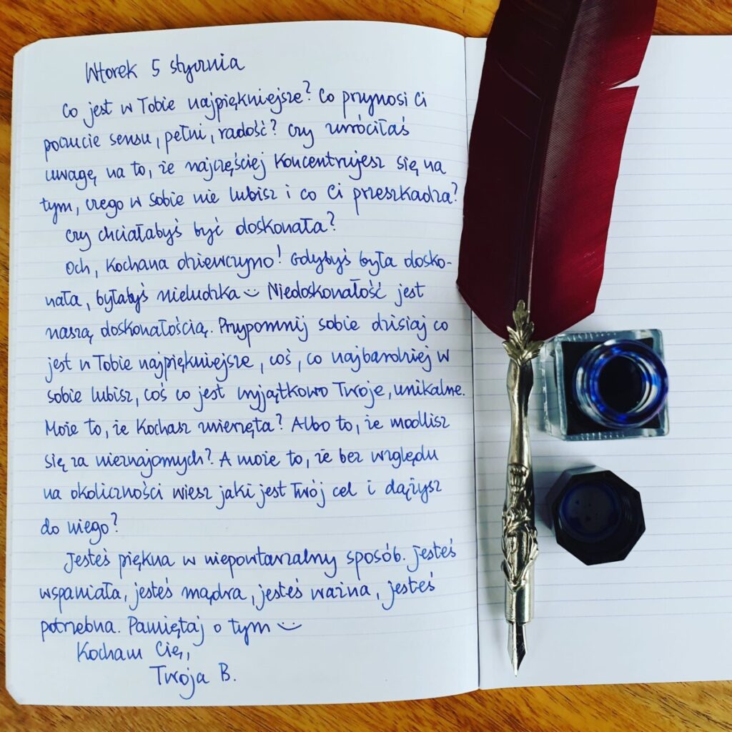 Och, kochana dziewczyno! Gdybyś była doskonała, byłabyś nieludzka 😊 Niedoskonałość jest naszą doskonałością. Przypomnij sobie dzisiaj co jest w Tobie najpiękniejsze, coś, co najbardziej w sobie lubisz, coś co jest wyjątkowo Twoje, unikalne. Może to, że kochasz zwierzęta? Albo to, że modlisz się za nieznajomych? A może to, że bez względu na okoliczności wiesz jaki jest Twój cel i dążysz do niego?