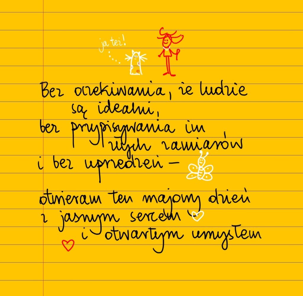 Bez oczekiwania, że ludzie są idealni, bez przypisywania im złych zamiarów i bez patrzenia na nich przez pryzmat dawnych zdarzeń – otwieram ten majowy dzień z jasnym sercem i otwartym umysłem ❤