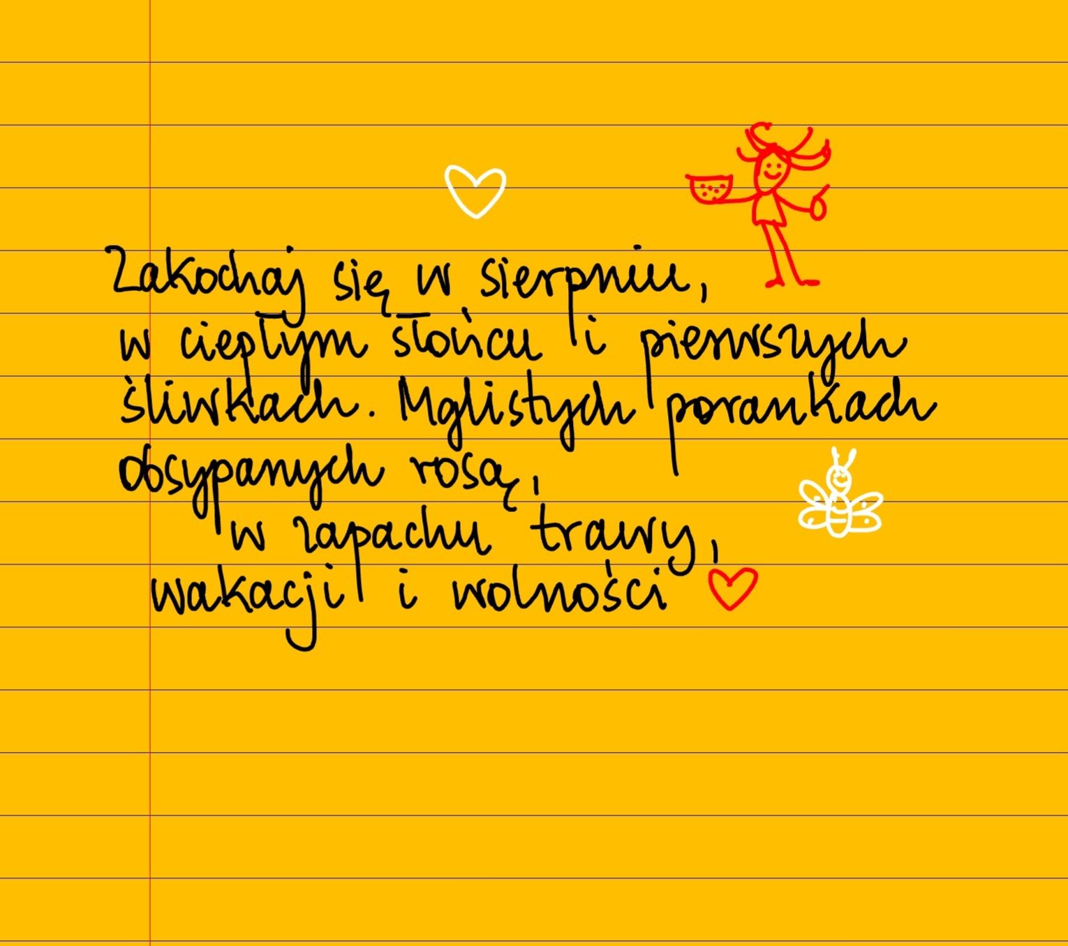 Zakochaj się w sierpniu, w ciepłym słońcu i pierwszych śliwkach. W mglistych porankach obsypanych rosą, w zapachu trawy, wakacji i wolności.