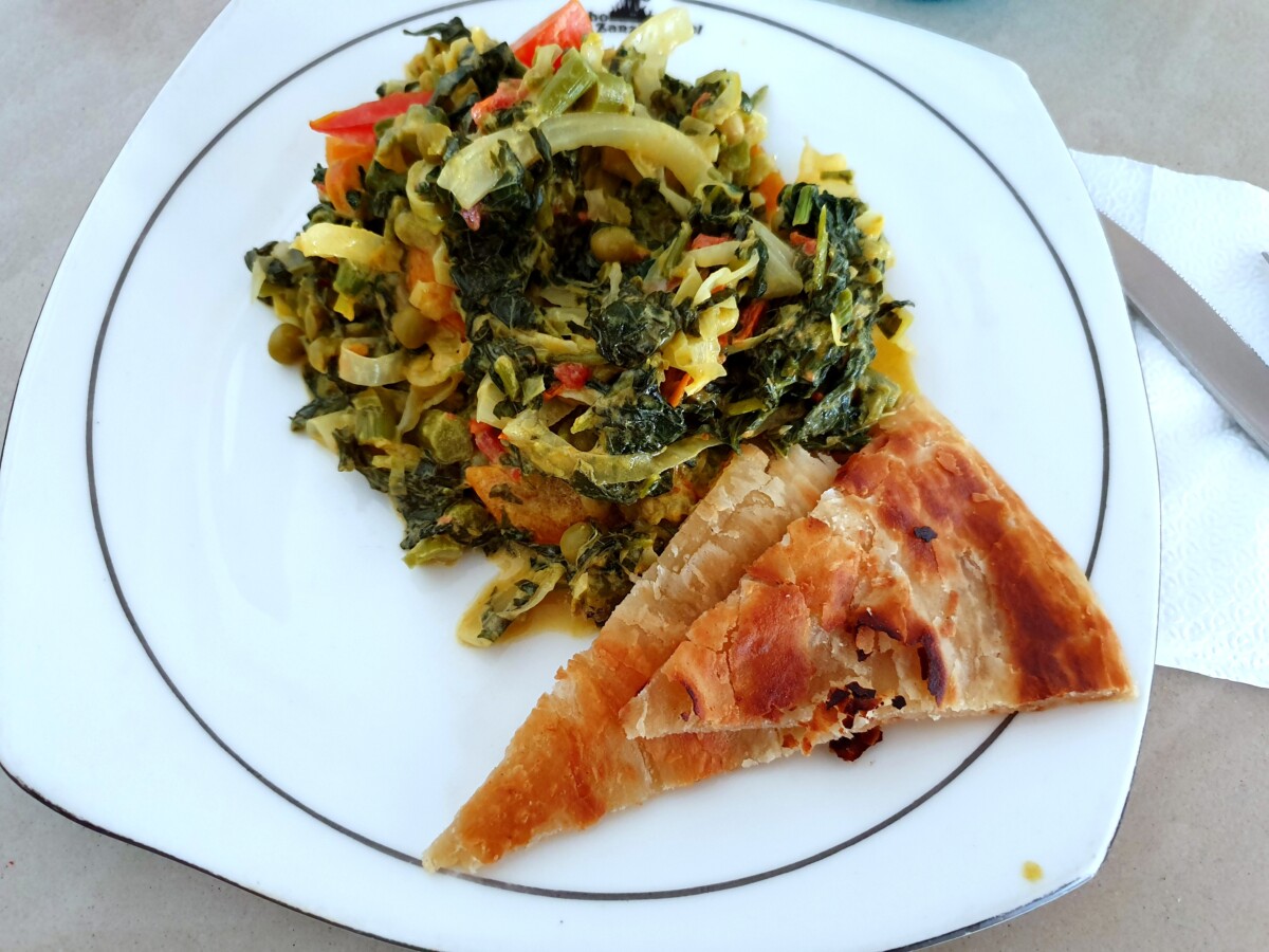 Moje mega zanzibarskie 艣niadanie: miejscowy szpinak z kapust膮 i przyprawami oraz placek chapati, smacznego i cudownej soboty 馃槉