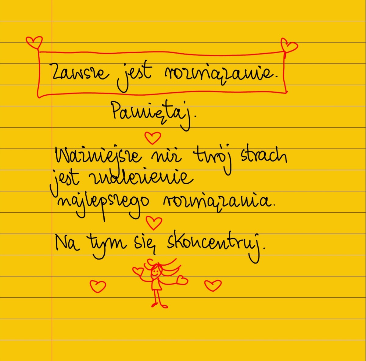 Zawsze jest rozwiązanie. Pamiętaj o tym. Ważniejsze nie twój strach jest znalezienie najlepszego rozwiązania. Na tym się skoncentruj. #żółtakartka
