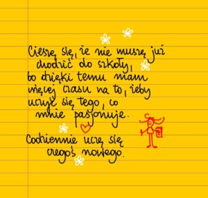 Żeby zobaczyć to co duże, trzeba czasem najpierw zobaczyć coś małego. Na przykład karbowane szmaragdowe liście buku, żołędzie pod dębami, lśniące żółte kwiatki dziurawca o pięciu płatkach, błyszczące kulki dojrzewającego czarnego bzu. Mądrość świata znajduje się w okruchach rzeczywistości, z których ciekawe oko wyłowi wszystkie potrzebne odpowiedzi na największe pytania. Nie pytaj jak i dlaczego, tylko spróbuj to zrobić. Wyjdź na spacer i rozglądaj się dookoła.