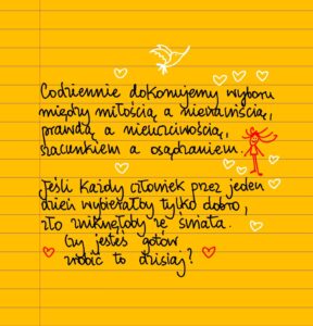 Zło istnieje po to, żeby dać nam możliwość wyboru. Każdego dnia wiele razy podejmujemy decyzje wybierając między złem a dobrem: czy zrobić coś wygodniej, czy właściwie; czy skłamać, czy powiedzieć prawdę; czy ukryć coś niewygodnego, czy szczerze się przyznać; czy trzymać urazę, czy z serca wybaczyć; czy wysłać komuś złą myśl, czy może raczej zachować także w myślach życzliwość i dobro. Codziennie przy wielu drobnych okazjach dokonujemy wyboru między miłością a nienawiścią, między prawdą a nieuczciwością, między szacunkiem a osądzaniem. Jeśli każdy człowiek przez jeden dzień wybierałby tylko dobro, zło zniknęłoby ze świata. Czy byłbyś gotowy podjąć się takiego zadania na jeden cały dzień? Jutro od rana? Każde wielkie dobro i przemiana całego świata zaczyna się od Ciebie