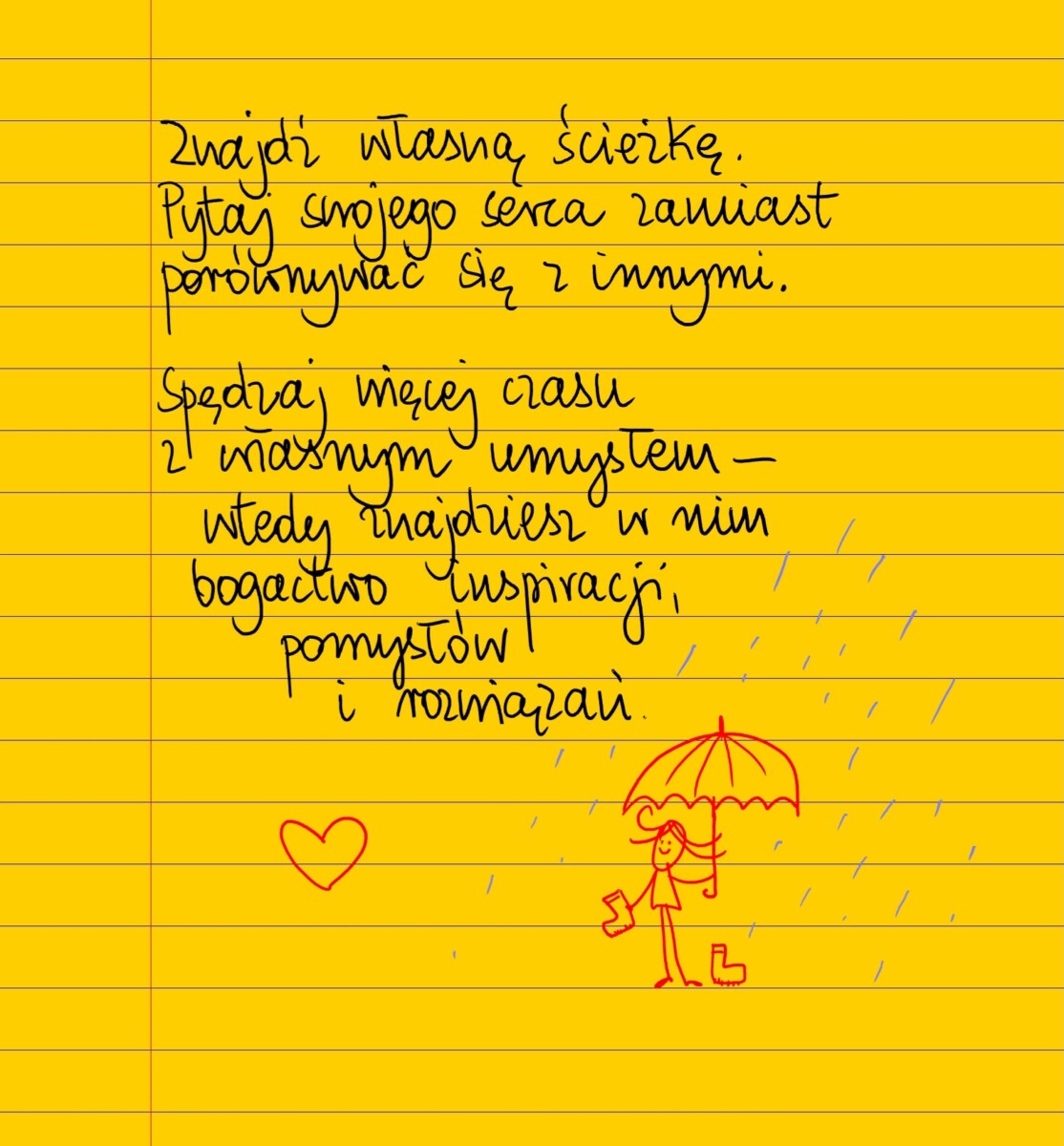 Znajdź własną ścieżkę. Pytaj swojego serca zamiast porównywać się z innymi. Spędzaj więcej czasu z własnym umysłem – wtedy znajdziesz w nim bogactwo inspiracji, ponysłów i rozwiązań. #żółtakartka