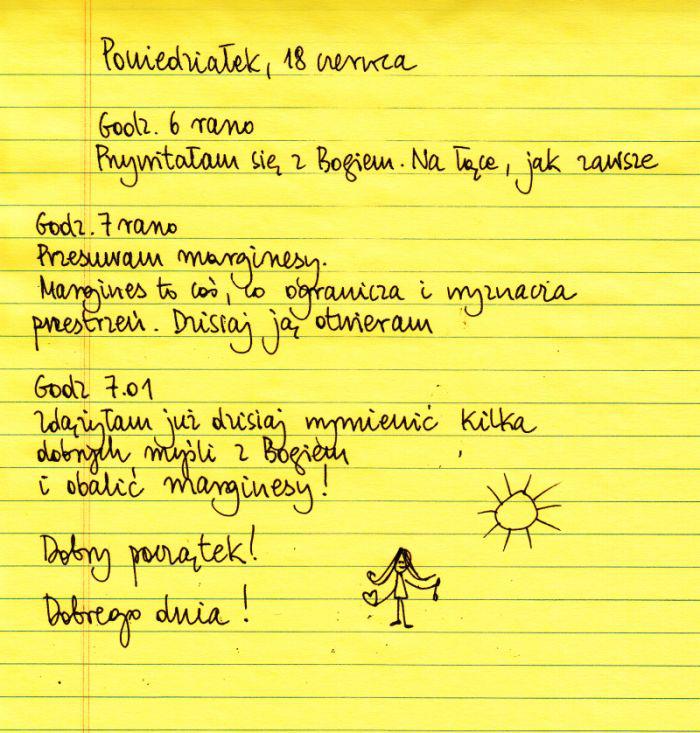 Pierwsza żółta kartka powstała w poniedziałek 18 czerwca 2012 roku. To był spontaniczny pomysł. Chciałam zamieścić na Facebooku coś napisanego odręcznie, znalazłam blok z żółtymi kartkami przywieziony kilka lat wcześniej z Londynu i moim ulubionym piórem wiecznym napisałam: Godz. 6 rano. Przywitałam się z Bogiem. Na łące, jak zawsze. Godz. 7 rano. Przesuwam marginesy. Margines to coś, co ogranicza i wyznacza przestrzeń. Dzisiaj ją otwieram. Godz. 7.01. Zdążyłam już dzisiaj wymienić kilka dobrych myśli z Bogiem i obalić marginesy! Dobry początek! Dobrego dnia!