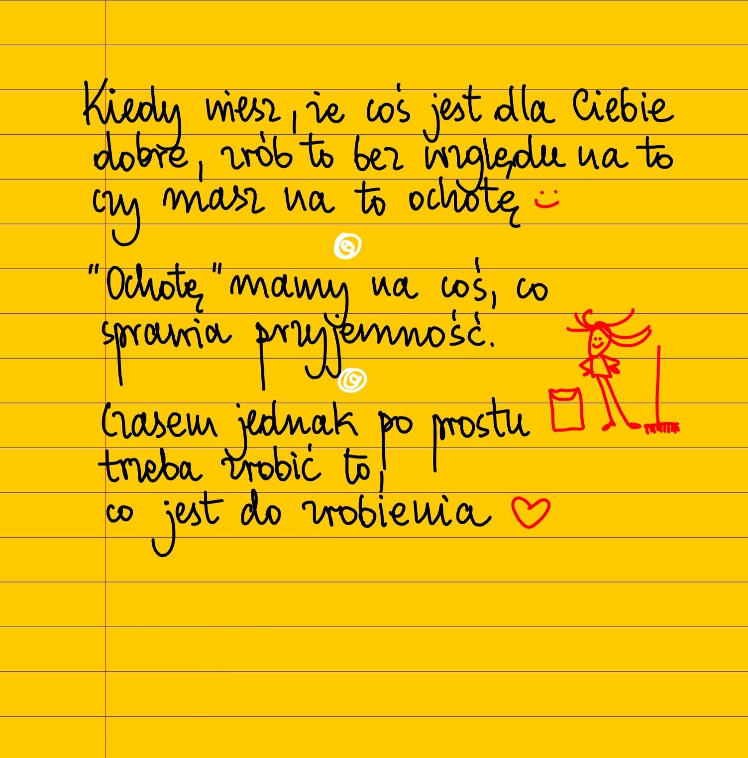 Kiedy wiesz, że coś jest dla ciebie dobre, to zrób to bez względu na to czy masz na to ochotę czy nie. „Ochotę” mamy na to, co sprawia przyjemność. Czasem jednak trzeba po prostu zrobić to, co jest do zrobienia ❤
