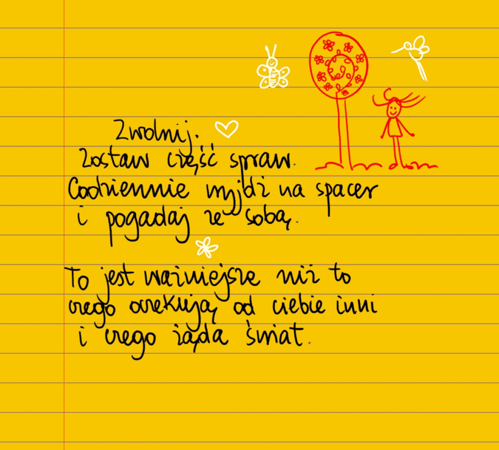 Zwolnij. Zostaw część spraw. Codziennie wyjdź na spacer i pogadaj ze sobą. To jest ważniejsze niż to czego oczekują od ciebie inni i czego żąda świat. #żółtakartka