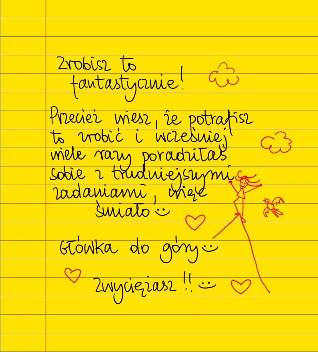 Zrobisz to fantastycznie! Przecież wiesz, że potrafisz to zrobić i wcześniej tyle razy poradziłaś sobie z trudniejszymi zadaniami, więc śmiało 😀 Główka do góry! 😀 Zwyciężasz! ❤❤ #żółtakartka