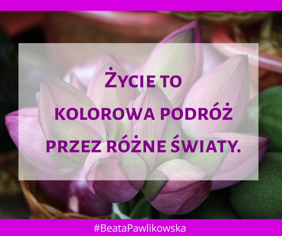 Życie to kolorowa podróż przez różne światy. I tak samo jak podczas egzotycznej ekspedycji, ciągle pokazuje mi nieoczekiwane miejsca i osoby, uczy mnie nowych umiejętności, poszerza moje horyzonty, daje mi lekcje pokory i mądrości.