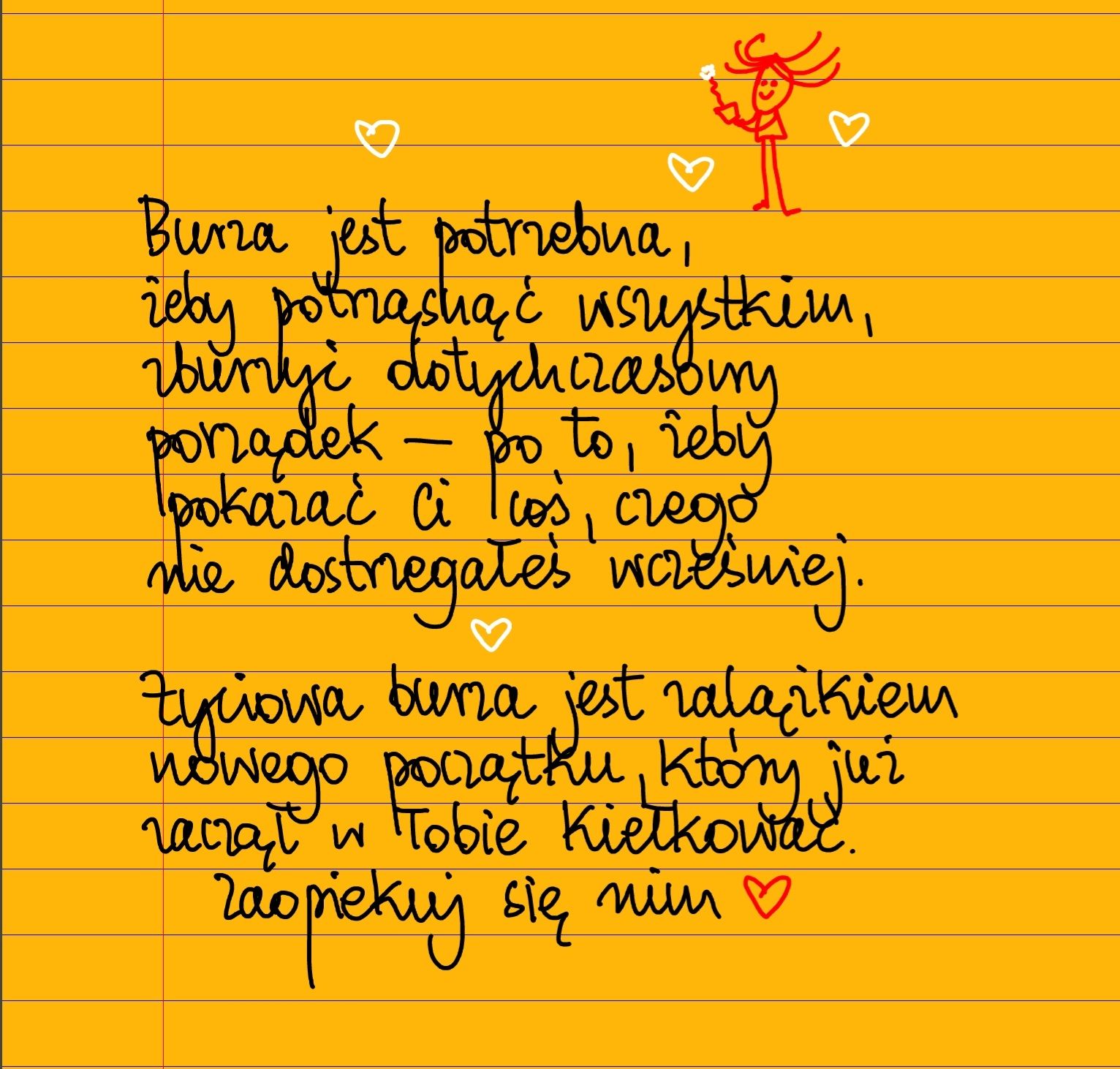Burza jest potrzebna do tego, żeby potrzasnąć wszystkim co jest i zburzyć dotychczasowy porządek po to, żeby pokazać ci coś, czego nie dostrzegałeś wcześniej. Życiowa burza jest zalążkiem nowego początku, który już zaczął w tobie kiełkować. Zaopiekuj się nim ❤