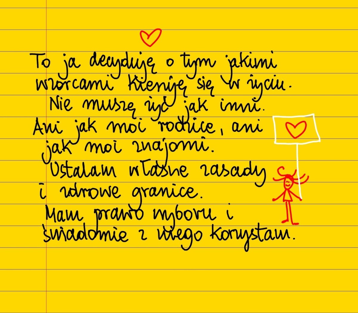 To ja decyduję o tym jakimi wzorcami kieruję się w życiu. Nie muszę żyć tak jak moi rodzice albo znajomi. Mogę ustalać własne zasady i zdrowe granice. W moim życiu mam prawo wyboru i świadomie z niego korzystam.#żółtakartka